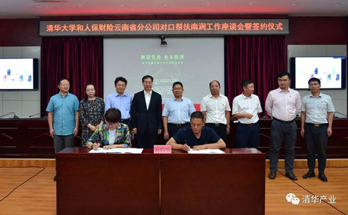 在姜胜耀、吉向阳、龙大伟、杜毓贞、朱涛、字文源,以及南涧县委常委、县委办公室主任张敬宗,清华大学挂职干部南涧县人民政府党组成员金峰,南涧镇副镇长、西山村第一书记沈正波等的见证下,王殿军与南涧县副县长吕亚新签订《清华附中对口帮扶协议》,汪健与西山村党总支书记赵维标签订《清华控股党委帮扶西山村党总支协议》,陈禹与吕亚新签订《南涧县与云南启迪无量山高原生态农业产业战略合作协议》和《南涧县与云南启迪康辉公司战略合作协议》,双磊与吕亚新签订《云南省人保财险公司与南涧县金融扶贫战略合作协议》,水滴公司联合创始人、水滴保总经理杨光与南涧县教育局局长杨映元签订《水滴公司捐赠贫困学生保险协议》。