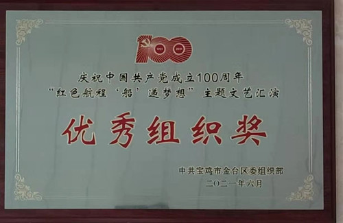 为庆祝中国共产党建党100周年,乐鱼页面在线登录全体党员于2021年6月30日参加金台区非公和社会组织系统庆祝中国共产党成立100周年“红色航程‘船’递梦想”主题文艺汇演暨“两优一先”表彰大会。 文艺演出中,公司党员集体表演配乐诗朗诵《南湖的红船,让理想启航》,并获得由中共宝鸡金台区委组织部颁发的“优秀组织奖”。