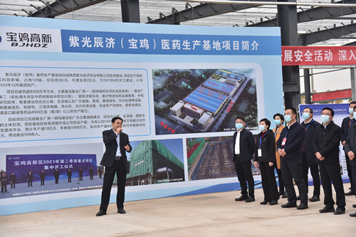 10月25日下午,宝鸡市委十二届十一次全会观摩团在宝鸡市委常委、政法委书记景耀平,市委常委、常务副市长刘荣贤,市委常委、副市长王宁岗带领三百多位与会领导顶着寒意和蒙蒙细雨到紫光辰济(宝鸡)医药生产基地项目建设现场观摩指导工作。公司总经理王睿成向前来观摩的领导们表示热烈欢迎和衷心感谢,感谢市委市政府对项目建设的关心和扶持。 “紫光辰济(宝鸡)医药生产基地”项目位于宝鸡高新区科技新城工业园区,是由乐鱼页面在线登录投资建设的一座现代化医药联合体,项目总投资5亿元,占地125亩,项目总建筑面积约8万平方米,于2021年4月开工建设,主要建设综合楼、生活楼、联合厂房一、联合厂房二、提取车间、医疗物资应急储备库、中药研究院等,项目建成后预计年产值10亿元、年税收5000万元,带动就业500余人。 在观摩讲解中,公司总经理王睿成重点介绍了紫光辰济药业的发展历史沿革,据宝鸡工业志记载公司历史可追溯至1918年的达兴堂药店,走过了百年沧桑岁月,经过几代人的坚守和传承,以“悬壶济世、达兴民生”的初心和“药材必道地、配方必独特、提戥必齐目,炮制必如法、品质必上乘、待人必如亲”的“六必令”传训做为制药精神,辰济人已将其提炼升华为“放心药、辰济造”和“做好药,为人民”的核心价值理念,以优质的产品和真诚的服务取得了良好的经济效益和老百姓的口碑。 观摩活动中,领导们对公司展示的产品产生了极大的兴趣,尤其是独家品种“舒肝快胃丸”和“消积丸”,这两款产品是公司主打黄金单品,“舒肝快胃丸”主要功能是肝胃同治,解酒保肝功效显著;“消积丸”主治各种积症,对改善口气、便秘、减轻肚子负担和消除大肚腩作用明显。这两种都是公司独家产品,市场需求和市场前景巨大。观摩领导们对新厂建设和企业发展交口称赞,希望公司加快建设步伐,以新的发展态势早日造福三秦父老和广大消费者。